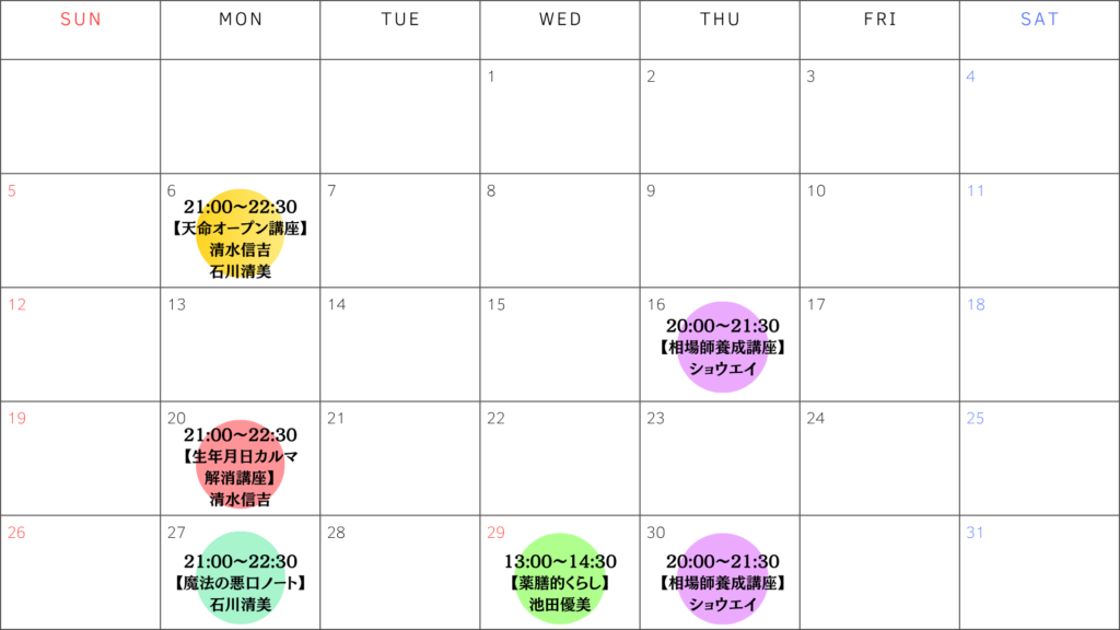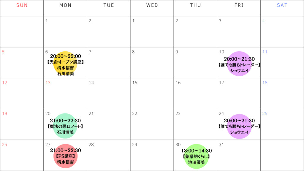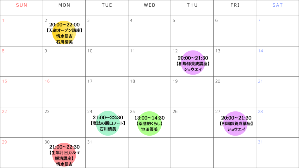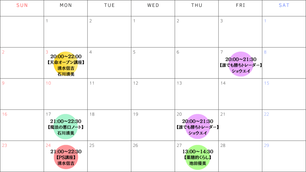 ※都合により、講義の日程や時間が変更される場合がございます。変更がある際はカレンダーに反映いたしますので、最新情報をご確認ください。